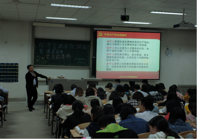 本次党课的主题为“党员的条件”。姜老师以问题“大家有没有写入党申请书?”开头引入了本次的主题。姜老师讲解了党组织对中国共产党员的总要求,其中包括“控制总量、优化结构、提高质量、发挥作用。”让同学们心中明白党组织对党员发展的要求,激励同学们以更严格的标准要求自己。姜老师讲述了入党的四个要求:1、年龄和成分的要求2、政治思想的要求3、组织纪律的要求4、缴纳党费的要求。通过姜老师细致的讲解,同学们清楚理解了身为学生党员应该履行的义务。随后,姜老师向同学们讲解了我国社会主义初级阶段的基本路线,党的十条基本经验,以及共产党员要坚持做到“两个务必”弘扬艰苦奋斗作风。通过本次的授课,同学们认识到应该以高度的责任感,强烈的使命感来做优秀的共产主义接班人,为党组织的壮大添砖加瓦。