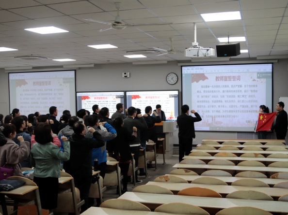 会议第一阶段,党委书记、副院长姬浩带领全院教师面对国旗,举起右手庄严宣读教师誓词。宣誓仪式后,全体教师签订了《kaiyun体育官方网站入口登录教师承诺书》。