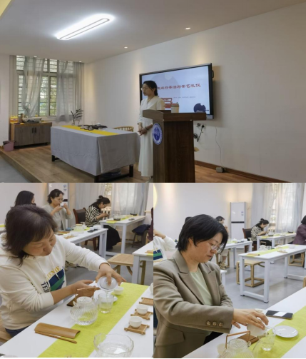 活动中茶艺老师向大家介绍了茶的礼仪以及各类茶器的使用方法,详细介绍了温杯、醒茶、冲泡、赏茶、饮茶等过程中的礼仪及注意事项,大家亲手尝试了如何正确使用盖碗的冲泡方法。在茶艺老师细心的讲解中,大家动手学习了冲泡技巧,举壶秀茶艺、低头品茶甘,一举一动均展示出女性优雅端庄的气质。
