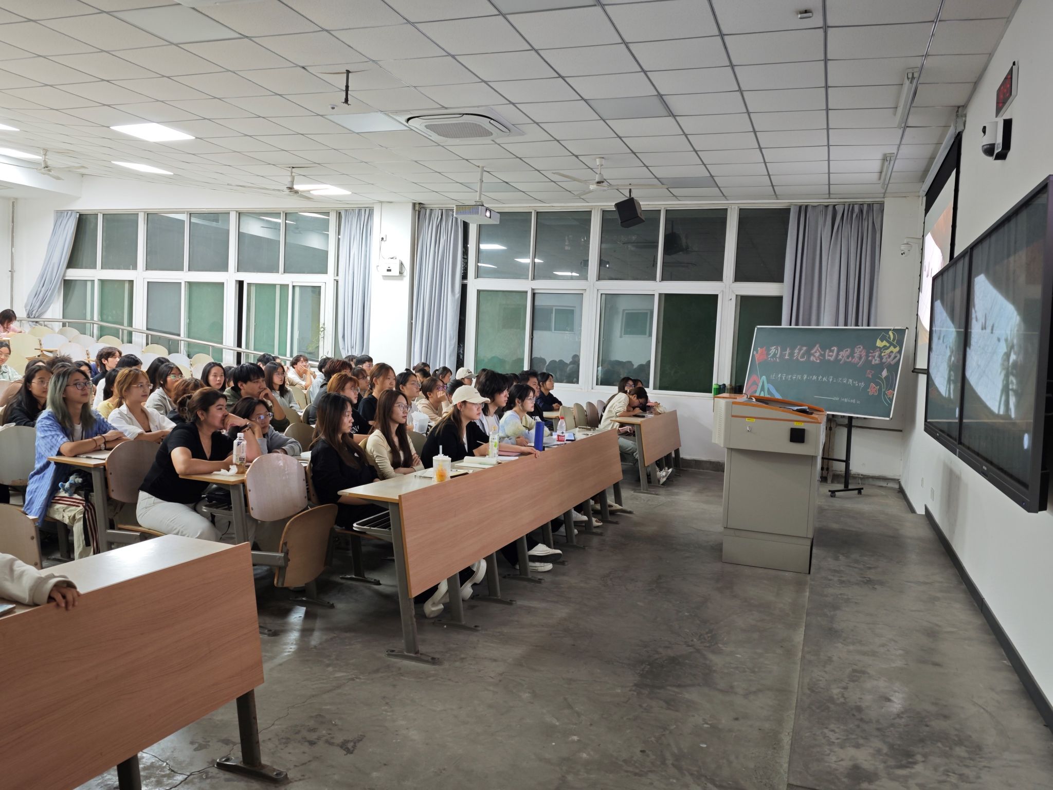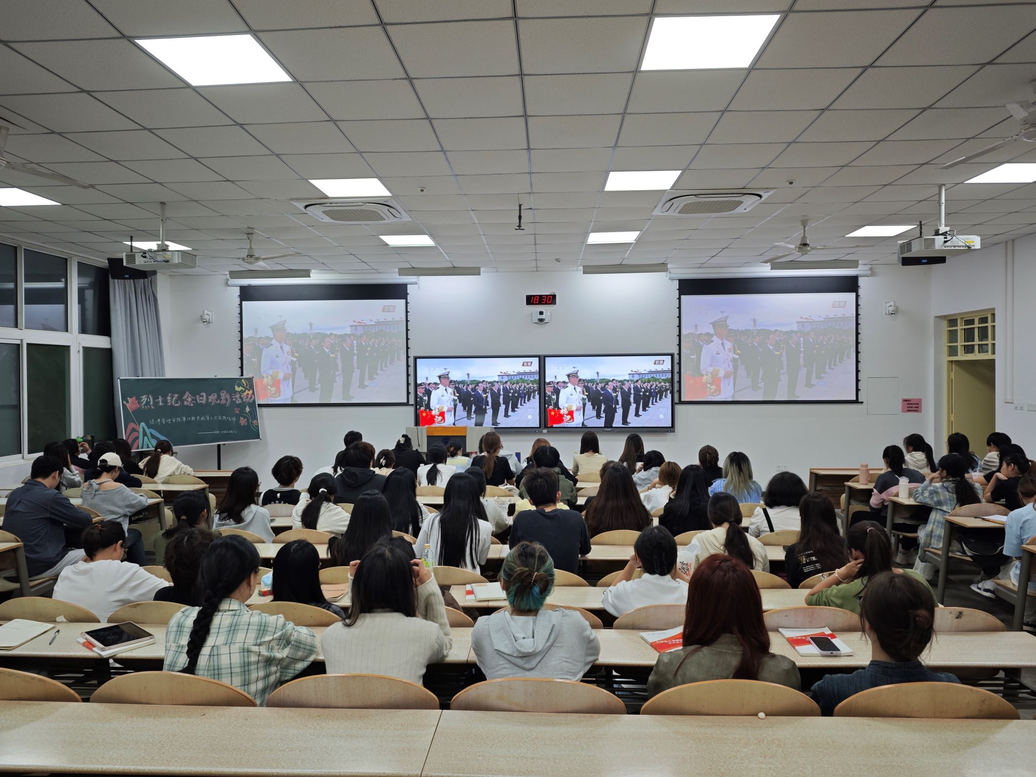 影片开场之前,先集体观看了烈士纪念日纪念实况活动,肃穆的气氛让同学们对革命烈士的缅怀、崇敬之情达到顶峰。