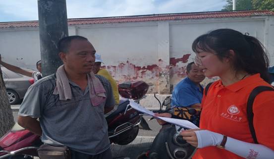 部分队员冒着高温走近烈日下等待招工的民工兄弟,与他们进行交流,了解他们的工作状态以及基本生活情况。 由于农民工文化水平较低,所以不能很好地配合填写问卷导致问卷质量不高等问题,队员们采取了代为填写的问答方式进行调研,家在西安周边的队员利用农民工休息的间歇上前以“聊家常”的方式结合自己家乡的实际情况在调研时直接抓住农民工兄弟的需求点开展调研。