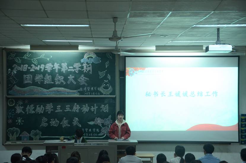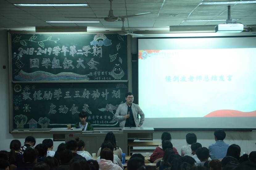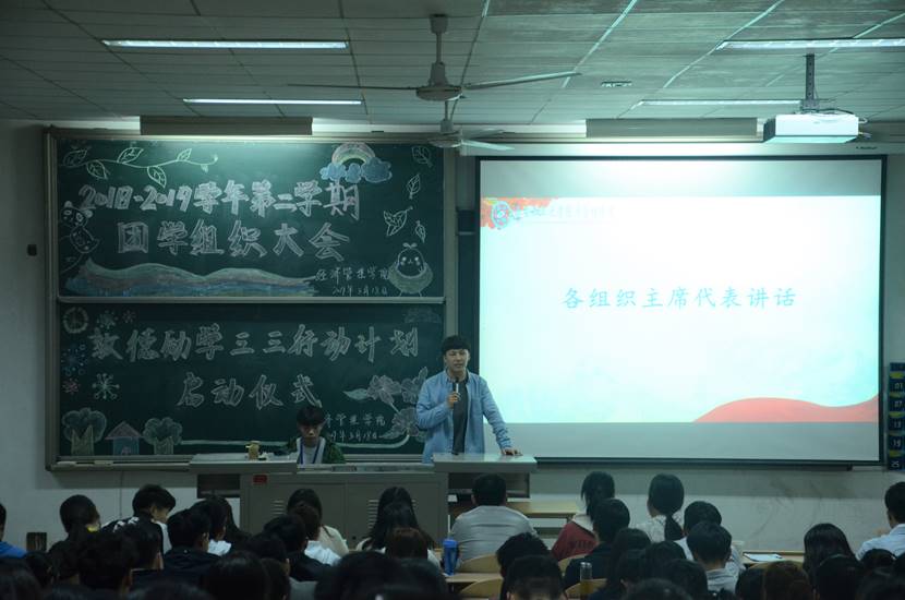 为做好新学期团学组织工作,促进“三三行动”计划更好地开展与实施,经管学院于2018年3月18日晚7点在教1-101召开2018-2019学年第二学期团学组织大会暨敦德励学“三三行动”计划启动仪式。出席本次会议的有经管学院团委书记侯剑波老师,近200名团学组织成员参加了本次大会。