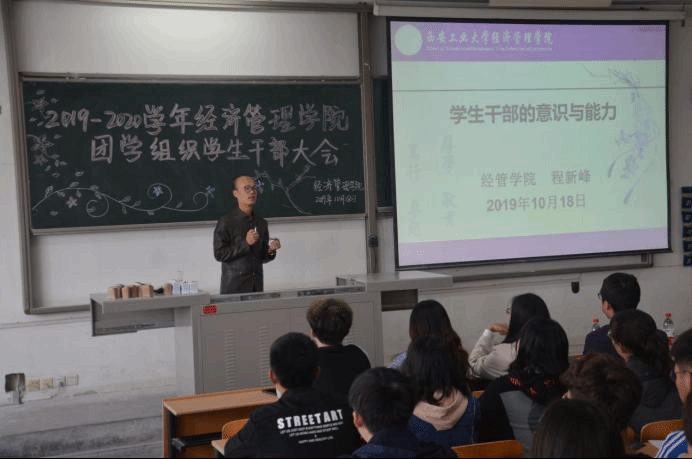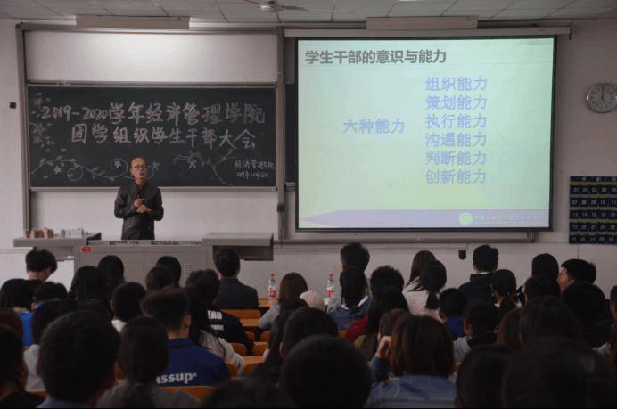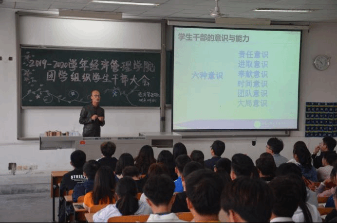 大会伊始,程新峰书记发表了关于学生干部的意识与能力的重要讲话并对学生干部提出了问题,即“为什么要当学生干部?”,引发了学生干部的深入思考。通过对学生干部的提问,程书记表示要做好学生干部,首先要具备的六种意识,即责任意识、进取意识、奉献意识、时间意识、团队意识、大局意识。其次,程书记以“怎样做好学生干部”为引,提出了学生干部应具备的六种能力,即组织能力、策划能力、执行能力、沟通能力、判断能力、创新能力。通过个人及工作实施的引例要求学生干部要明确自身责任,合理分配个人时间,保持“与时俱进,保持创新”的活力,传递爱国、爱党正能量。最后书记提出忠告:“成功=目标+计划+行动”,并告诫学生干部应规范自身行为,提高各方面素质,做到全力支持学院工作。