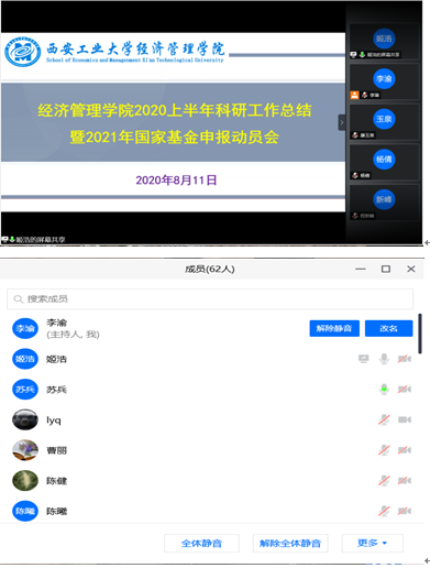 8月11日下午19:00,kaiyun体育官方网站入口登录通过腾讯会议组织召开了kaiyun体育官方网站入口登录2020上半年科研工作总结暨2021年国家基金申报动员会启动会议。会议由经管学院姬浩副院长主持。经管学院全体院领导、学术委员会成员、团队负责人、学科(学术)带头人(负责人、秘书)、部分教师代表等六十多位老师参加了本次会议。首先,姬浩副院长将学院2020年上半年科研工作进行了总结。接着,姬浩副院长对学院2021年国基金、教育部项目申报工作做了安排,并表示,学院后期将邀请校外专家为kaiyun官网教师国基金申报书进行评审,学院方面会为老师们提供一切可能的帮助与支持,助力老师们的国基金申报工作。最后,苏兵院长做了2021年国基金项目申报动员讲话并对目前国基金申报形势进行分析总结,鼓励各位老师在假期间合理安排时间,做好2021年国基金申报工作。
