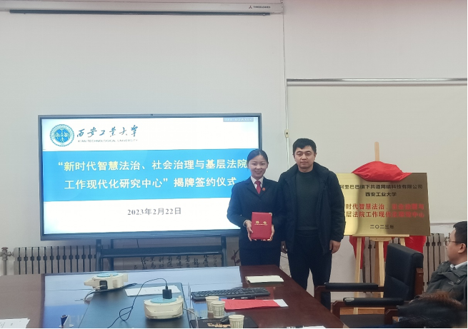 2月22日中午,kaiyun体育官方网站入口登录与西安未央区人民法院,西安丝路物联网产业园管理有限公司(倪光南院士专家工作站),阿里巴巴旗下共道网络科技有限公司合作签约,暨新时代智慧法治,社会治理与基层法院工作现代化研究中心揭牌仪式在kaiyun体育官方网站入口登录教5-520会议室举行。未央区人民法院未央宫人民法庭庭长郭丽华;共道网络科技有限公司副总裁刘业轮,总监王晨昊;丝路物联网产业园管理有限公司倪光南院士专家工作站发展合作部主任毛真;kaiyun体育官方网站入口登录院长苏兵,党委书记姬浩,党委副书记王育晓,副院长焦源出席了揭牌签约仪式。