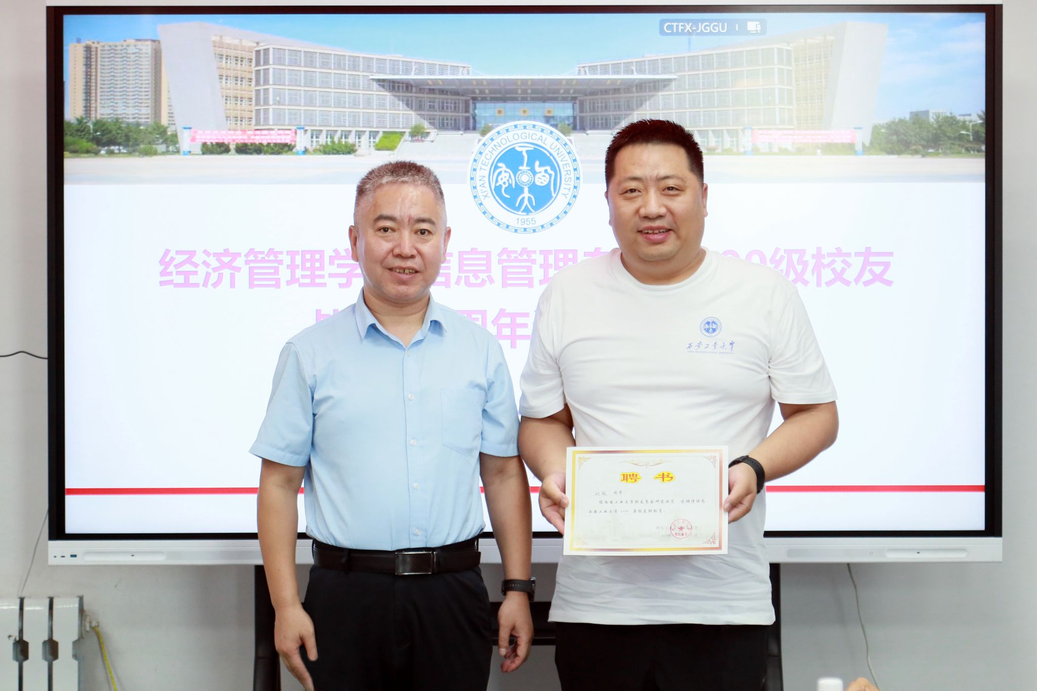 王守民为校友胡锐颁发了校友联络员证书,表彰他在联系和服务校友方面所做出的努力,并合影留念。