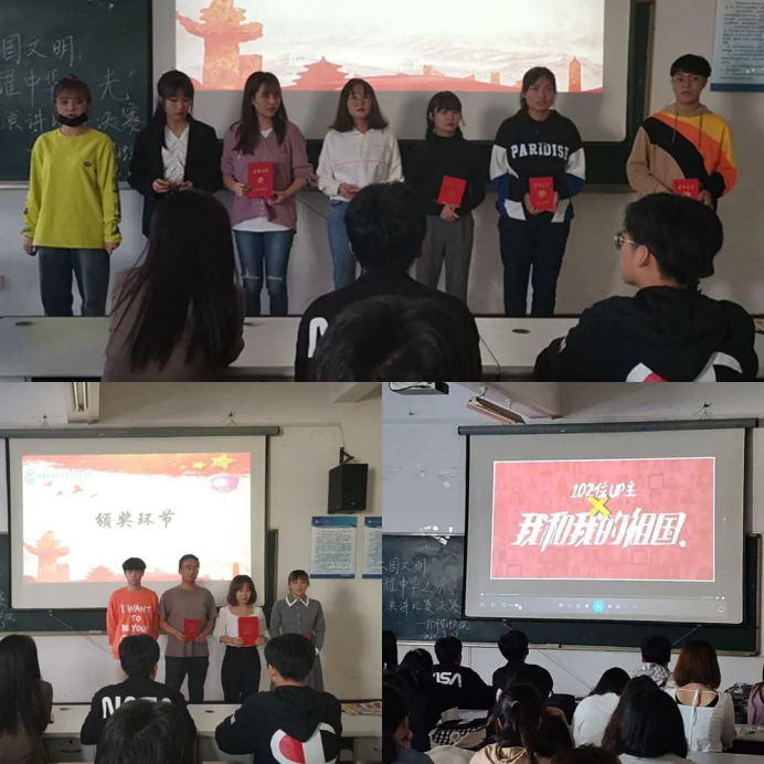 大赛前期,《祖国颂》等九份入围决赛作品由团学组织学生干部初评级选出。随后,入围的各位参赛选手齐聚一堂,在主持人向大家介绍了本次比赛的评委及相关赛制后,依次进行个人作品演讲。在比赛中,选手们紧扣主题,以饱满的热情表达着对大国文明的热爱与赞美,以昂扬的口吻述说着对中华之光的崇敬与自豪,赢得台下阵阵掌声。随着比赛进入尾声,在场的同学一同观看《我和我的祖国》短片,其浓厚的爱国气息与民族情怀深深烙印在每一位高举时代旗帜的新青年心中,激励着广大青年们不断创新,勇于奋斗。比赛结束,六号选手张娇艳对《我爱你,中国》的精彩演绎,获得了评委与观众的一致好评,赢得桂冠。最后,评委们为本次比赛获奖选手颁奖并进行合影留念,各参赛选手还在校园中于红旗下歌颂亲爱的祖国,献出自己的祝福,抒写优美的华章!