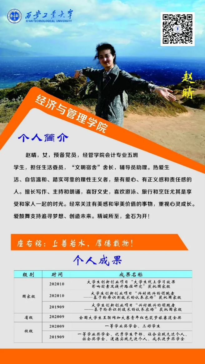 赵晴,女,预备党员,kaiyun体育官方网站入口登录会计专业五班生活委员,2019年凭大学生创新创业项目“兴村振兴的领跑者——基于轮廓识别技术的认养农村”获国家级奖项,2020年以大学生创新创业项目“兴村振兴的领跑者——基于轮廓识别技术的认养农村”以及“大学生线上学习效果影响因素及提升路径研究”分别获批国家级奖项。在校期间共获省级奖项1项、校级奖项2项。