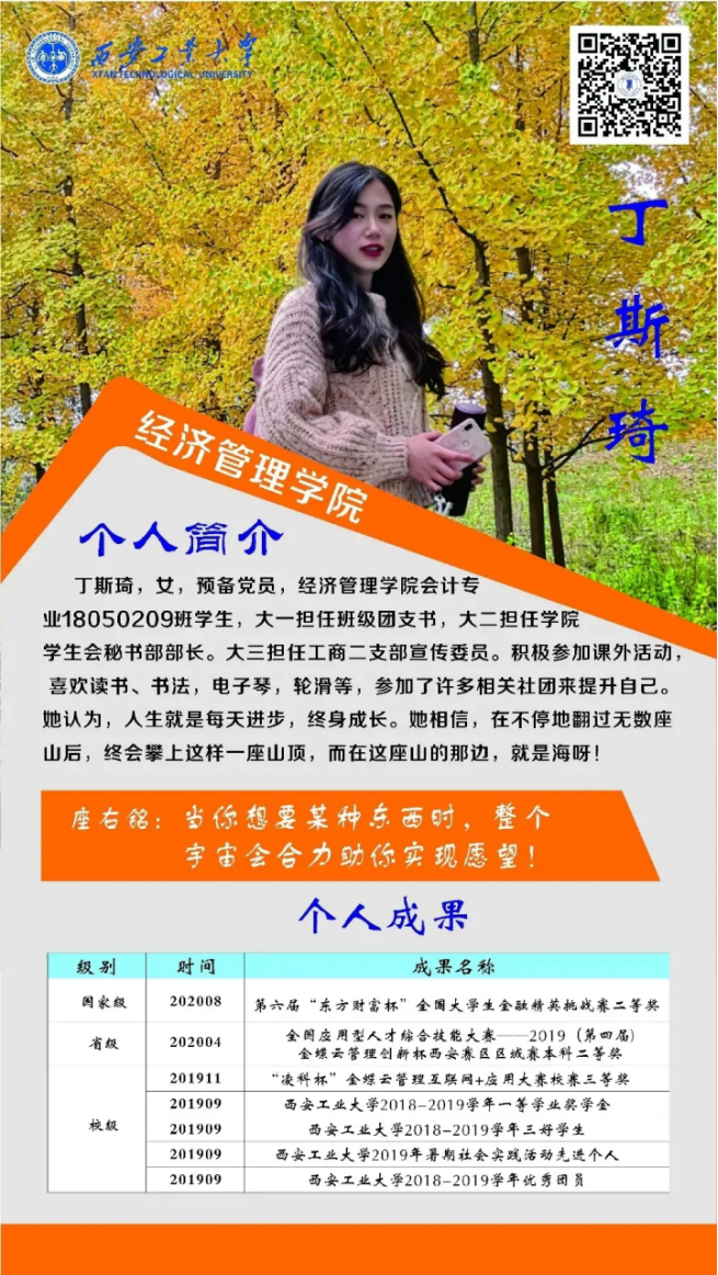 丁斯琦,女,预备党员,kaiyun体育官方网站入口登录会计专业18050209班团支书,曾获第六届“东方财富杯”全国大学生金融精英挑战赛二等奖,在校期间共获省级奖项1项、校级奖项5项。