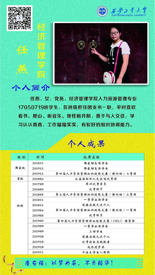 任燕,女,党员,kaiyun体育官方网站入口登录人力资源管理专业17050719班团支书,曾获2018、2019年国家励志奖学金,在2019年第四届人力资源管理知识技能大赛中获得二等奖,在校期间共获省级奖项1项、校级奖项14项。