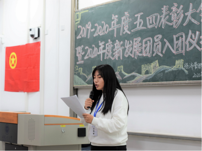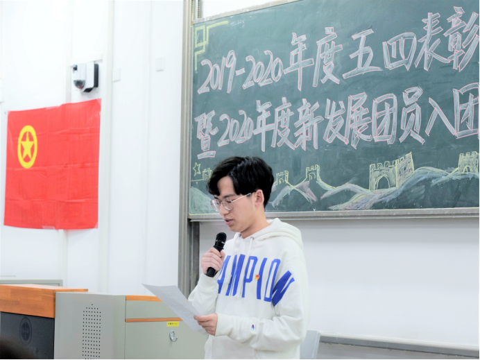 大会伊始,奏唱中华人民共和国国歌。其次,由许金鑫发言,讲述了青年团员们的责任与使命,勉励共青团员不断奋斗,在实际行动中提升个人思想境界。接着由康怡宣读2019-2020年度五四评优表彰文件。随后,进行五四表彰颁奖仪式,由许金鑫以及团学组织主席团为获奖团体及个人颁奖,并且由优秀获奖代表王鸽发言,鼓励同学们努力前进、不负韶华。紧接着,进行2020年度新发展团员入团仪式,由徐笑影带领新发展团员进行入团宣誓,并由团员代表们为新团员佩戴团徽。最后,全体起立奏唱团歌,大会在激情澎湃的团歌声中结束。