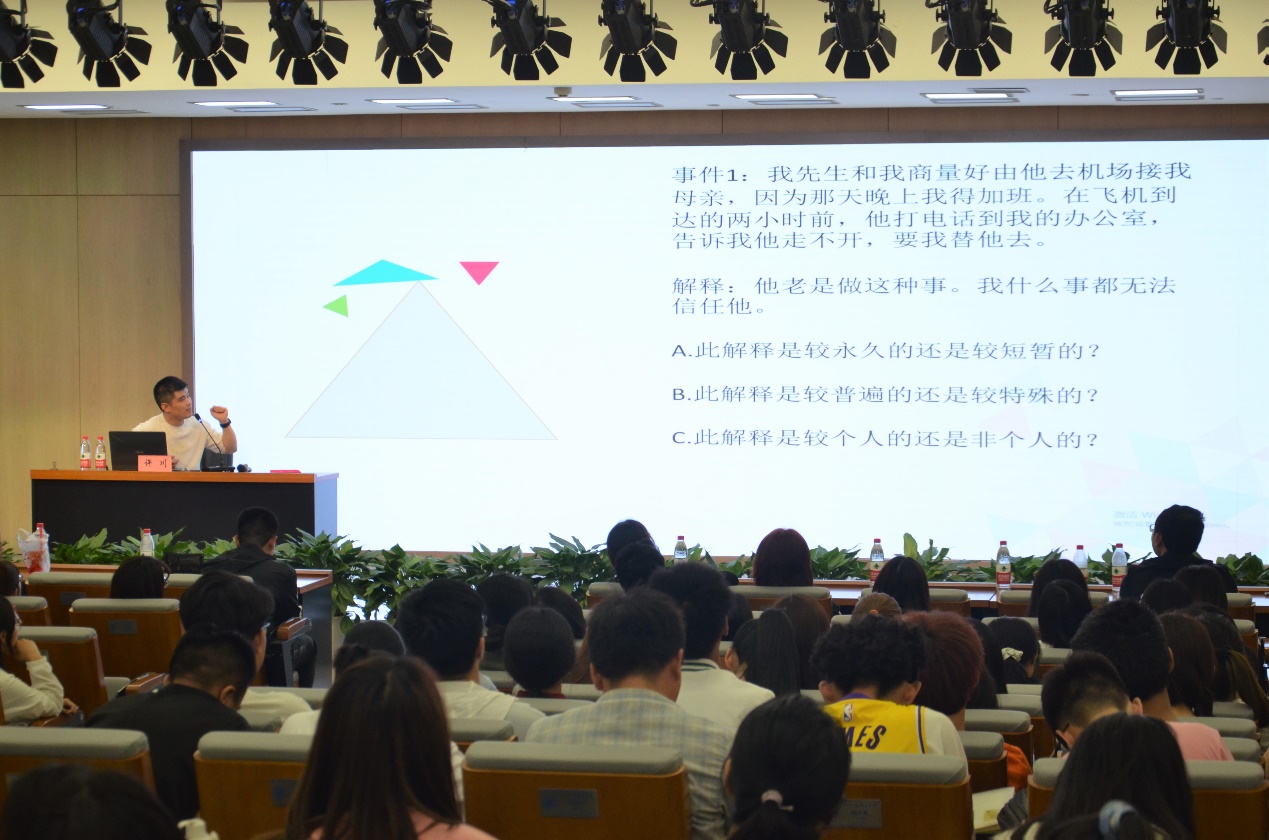 通过案例讲解,与学生密切互动,引导学生理性认识人生中面临的心理问题,他表示,“我们的生活中常常会出现一些棘手的难题,面对这些难题,我们要尽可能尝试换一种不同的解释风格去解释那些无法解释的困难,也许我们的人生会迎来新的可能。”