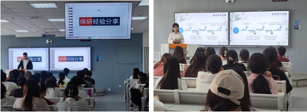 接下来20级会计学专业保研学生王奔峰、人力资源管理专业保研学生刘怡向大家分享了保研经验。两人分别从保研流程、保研条件及加分项、保研准备等方面进行分享,强调综合成绩的重要性,提醒大家把握时间节点,要善于运用各种媒介搜索信息,学会打破信息差。